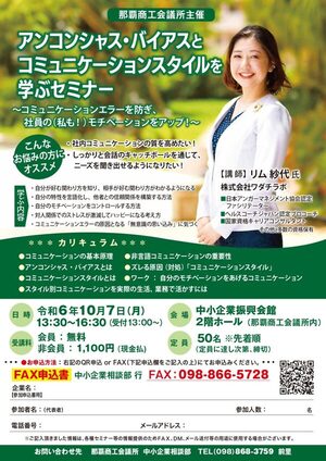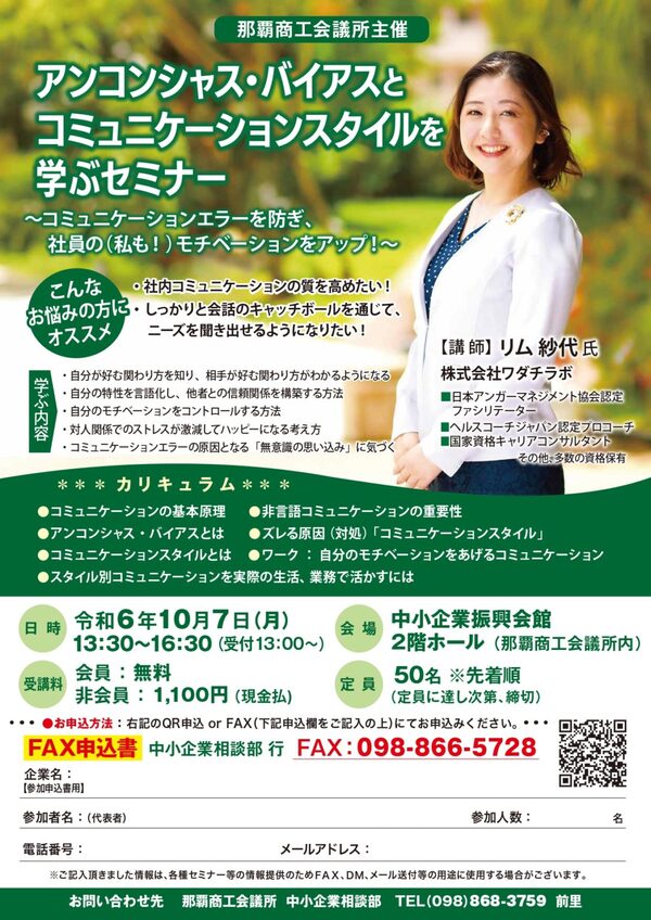 2024年10月7日(月) 午後1時30分~午後4時30分那覇市商工会議所主催「アンコンシャス・バイアスと コミュニケーションスタイルを 学ぶセミナー」に弊社スタッフ リム紗代が講師として登壇します!・社内コミュニケーションの質を高めたい!